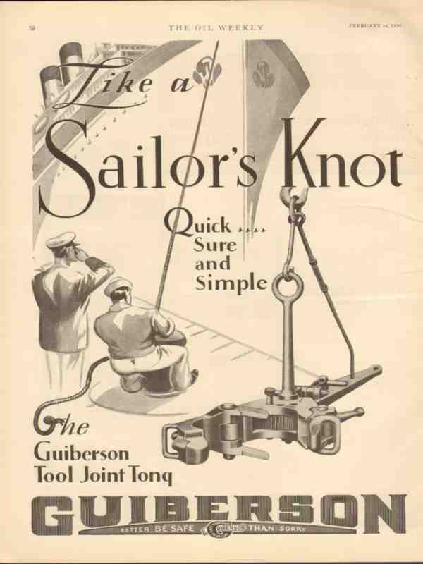 Original oil and gas trade magazine vintage ad for THE GUIBERSON CORPORATION, of Dallas, TX. Like a Sailor's Knot, Quick, Sure and Simple, The Guiberson Tool Joint Tong. Unique 1930 old petroleum oilfield drilling equipment magazine advertisement. Great graphics.