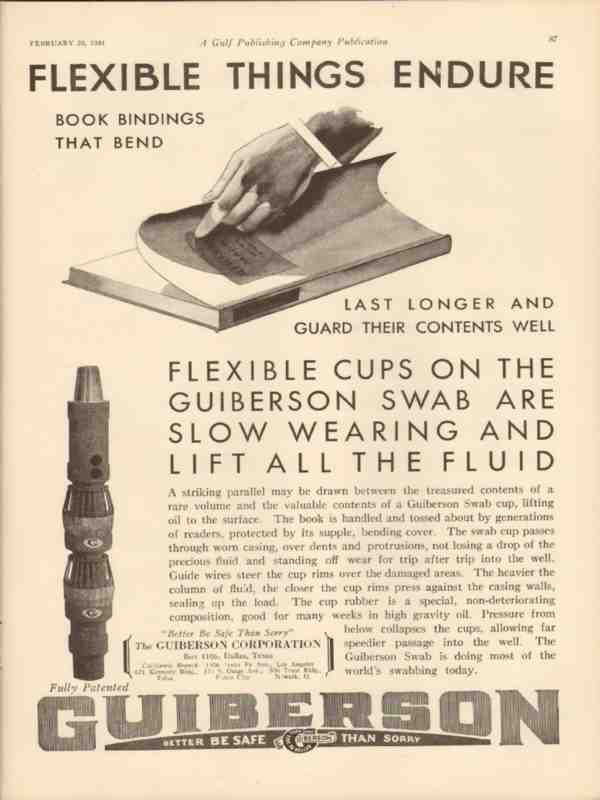 Original oil and gas trade magazine vintage ad for THE GUIBERSON CORPORATION of Dallas, TX.  Last Longer and Guard Their Contents Well. Flexible cups on the Guiberson Swab are slow wearing and lift all the fluid. This unique 1931 old oilfield petroleum well drilling tools and equipment magazine advertisement would display beautifully matted and framed. Nice graphics.