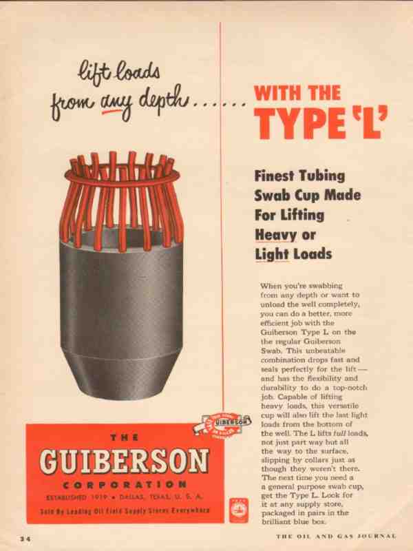 Original oil and gas trade magazine vintage ad for THE GUIBERSON CORPORATION of Dallas, TX. Lift Loads from Any Depth with the Type L Tubing Swab Cup. This unique 1955 old oilfield petroleum drilling equipment magazine advertisement would display beautifully matted and framed. Nice graphics. Nice graphics.