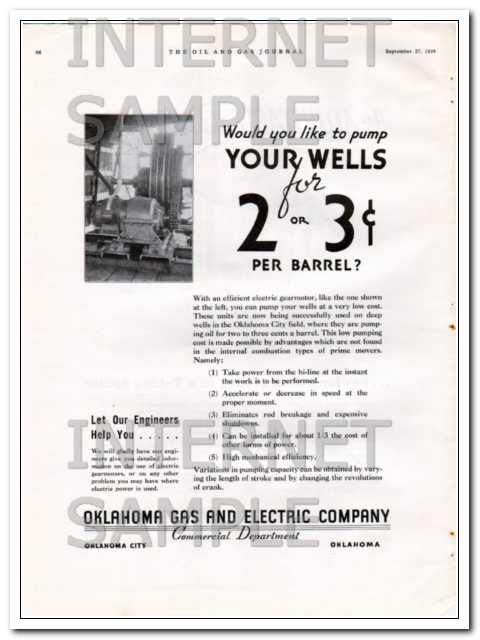 Original oil and gas trade magazine vintage ad for THE GUIBERSON CORPORATION of Dallas, TX. This Adjustable Guide Head has Long Been Needed in a Tubing Spider. Unique 1934 old oilfield petroleum drilling equipment industry magazine advertisement. On the reverse side is an ad for OKLAHOMA GAS AND ELECTRIC COMPANY of Oklahoma City, OK. Would You Like to Pump Your Wells for 2 or 3 cents Per Barrel? Approximate size 10 x 13 inches.