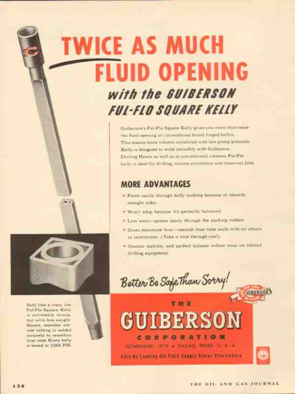 Original oil and gas trade magazine vintage ad for THE GUIBERSON CORPORATION of Dallas, TX.  Twice as Much Fluid Opening with the Guiberson Ful-Flo Square Kelly. Unique 1953 old oilfield petroleum well industry equipment magazine advertisement.