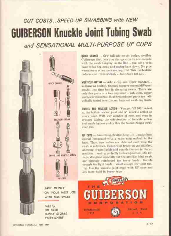 Original oil and gas trade magazine vintage ad for THE GUIBERSON CORPORATION, of Dallas, TX. Cut Costs, Speed-Up Swabbing with Guiderson Knuckle Joint Tubing Swab and Sensational Multi-Purpose UF Cups. Unique 1959 old oilfield petroleum drilling swab industry magazine advertisement.