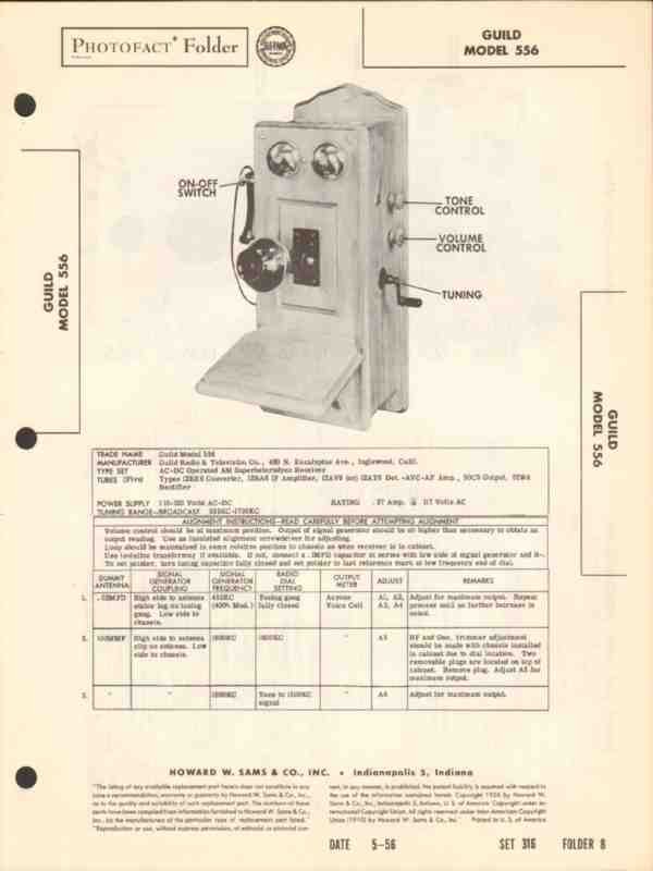 Vintage GUILD model 556 5 tube Superheterodyne AM radio receiver. Original old Sams Photofact manual includes schematic, layout, alignment instructions, voltage & resistance test chart, repair parts list and description. 4 pages. Dated 1956. Guild Radio and Television Co., of Inglewood, CA. This manual would make a sensational accompaniment to your classic radio equipment.