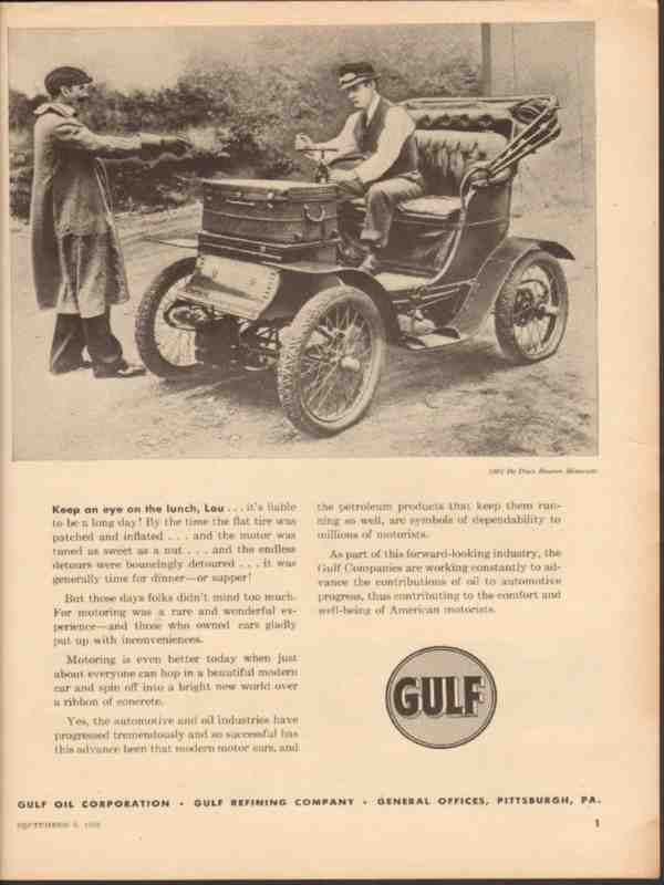 Original oil and gas trade magazine vintage ad for GULF OIL CORPORATION of Pittsburgh, PA. Pictured is a 1901 De Dion Bouton Motorette. Motoring in those days was a rare and wonderful experience and those who owned cars gladly put up with many inconveniences. Unique 1952 old gasoline service station industry magazine advertisement. Nice graphics.