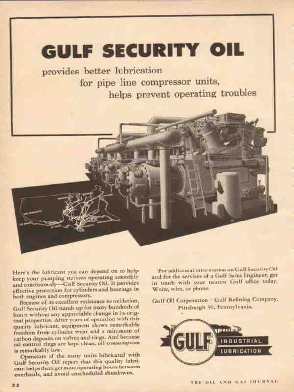 Gulf Oil Corp 1954 Vintage Ad Security Lubrication Pipeline Compressor