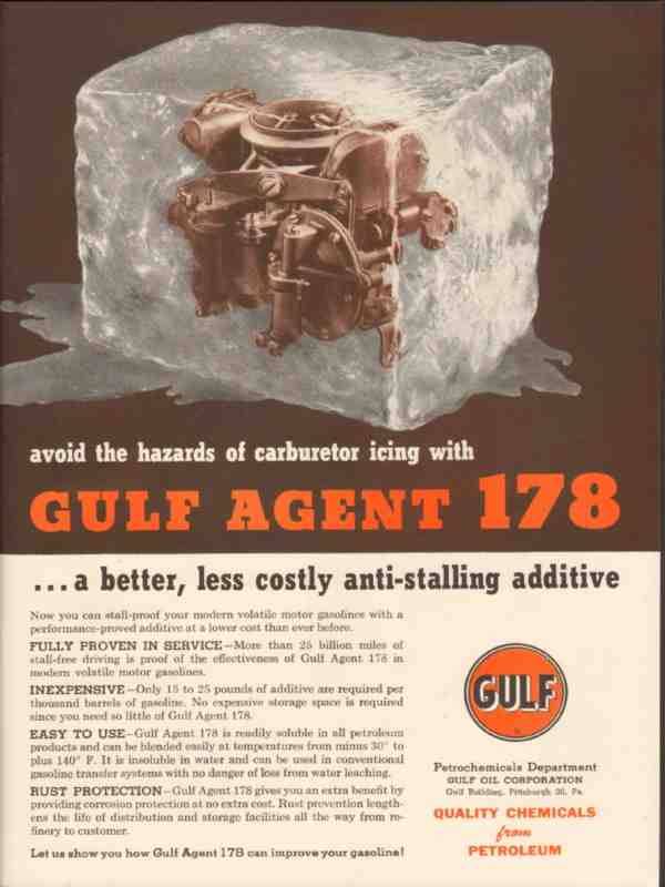 gulf oil corp 1957 avoid hazards carburetor icing additive vintage ad