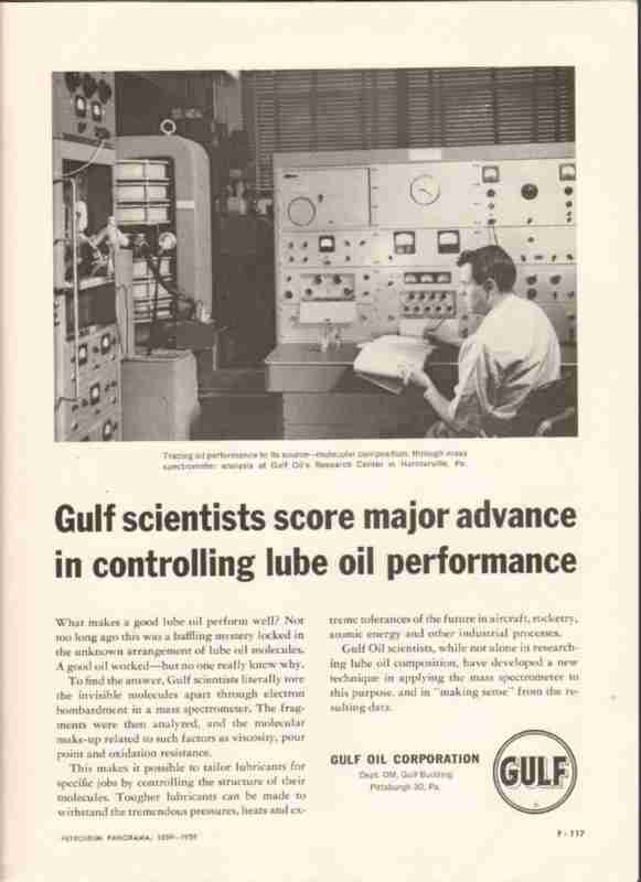 Original oil and gas trade magazine vintage ad for GULF OIL CORPORATION & Gulf Oil Research Center of Harmarville, PA. Unique 1959 old petroleum lube industry magazine advertisement would look fantastic matted and framed.
