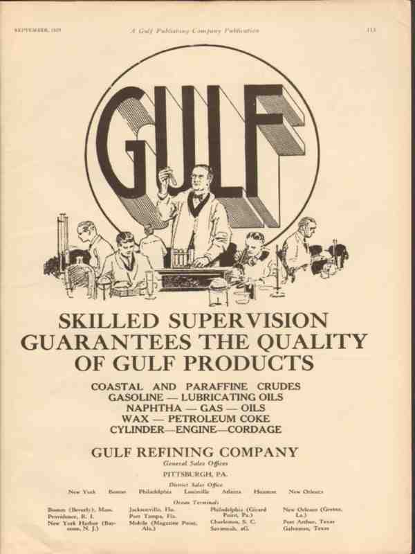 Original oil and gas trade magazine vintage ad for GULF REFINING COMPANY of Pittsburgh, PA. Skilled Supervision Guarantees the Quality of Gulf Products. Unique 1929 old petroleum products refining process magazine advertisement. Nice graphics.