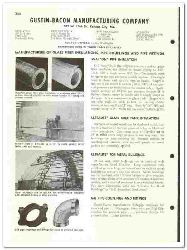 Products include Snap*On Pipe Insulation, Ultralite Glass Fiber Tank Insulation, Ultralite for Metal Buildings and G-B Pipe Couplings & Fittings, all are featured.