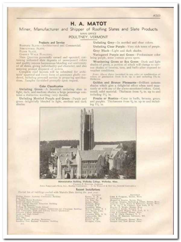 Original roofing trade vintage catalog for H. A. MATOT, INC. Main office and factory was located in Poultney, VT. Miners, manufacturers and shippers of roofing slates and slate products. Shown is the Administration Building, Wellesley College in Wellesley, MA. John Farquhar's Sons roofing contractors. Unbound from a large 1933 architectural catalog, this unique old one page technical brochure would display beautifully matted and framed. A fantastic addition to your retro roofing construction library. Light damp stain on top and bottom edges.