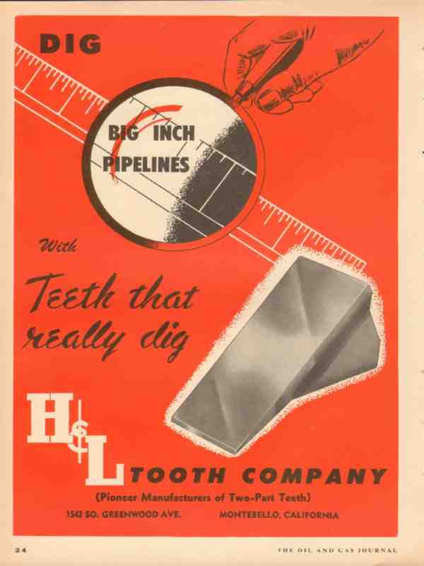 Original oil and gas trade magazine vintage ad for H & L TOOTH COMPANY, was located at 1543 South Greenwood Avenue, Montebello, CA. Dig Big Inch Pipelines with Teeth That Really Dig. Pioneer manufacturer of Two-Part Teeth. This unique 1953 old oilfield petroleum pipeline industry tractor equipment magazine advertisement would display beautifully matted and framed. Nice graphics.