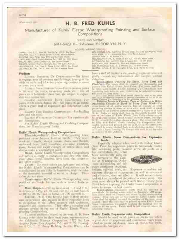 Original paint industry trade vintage catalog for H. B. FRED KUHLS. Main office and factory were located at 6411-23 Third Avenue, Brooklyn, NY. Manufacturers of elastic waterproofing pointing and surface compositions. Compositions are provided. A few of the many uses are illustrated. Unbound from a large 1933 architectural catalog, this unique old two page technical brochure would display beautifully matted and framed. A fantastic addition to your retro waterproofing library. Pages are detached and may contain a small amount of residual glue. Light damp stain on page edges.