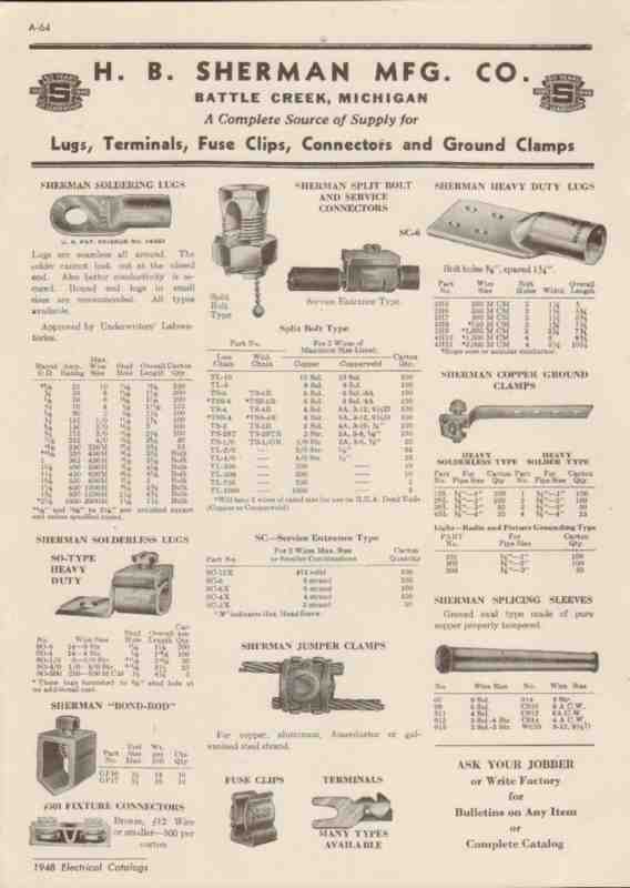 Original electrical trade vintage catalog for H. B. SHERMAN MANUFACTURING COMPANY. Main office and factory was located in Battle Creek, MI. Manufacturers of lugs, connectors, fuse clips, connectors and ground clamps. Disbound from a large 1948 electrical construction materials book, this unique old one page technical specifications brochure would display wonderfully matted and framed. A marvelous addition to your retro electric equipment library.