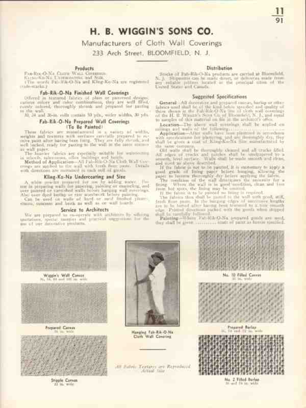 Original wall trade vintage catalog for H. B. WIGGIN'S & SONS COMPANY. Main office and factory was located at 233 Arch Street, Bloomfield, NJ. Manufacturers of Cloth Wall Coverings. Fab-Rik-O-Na Finished Wall Coverings, Kling-Ko-Na Undercoating and Size. Numerous product images, detailed descriptions and suggested specifications provided. Unbound from a large 1938 architectural catalog, this unique old one page technical brochure would display wonderful matted and framed. Nice graphics. A terrific addition to your retro wall construction library.