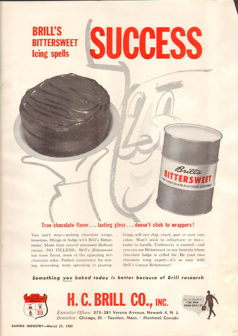 Original commercial bakery trade magazine vintage ad for H. C. BRILL COMPANY, INC of Newark, NJ. True chocolate bittersweet icing spells success. Lasting gloss doesn't stick to wrappers. Perfect consistency for mixing, decorating, knife spreading or pouring. 1959 unique old baking industry advertisement.
