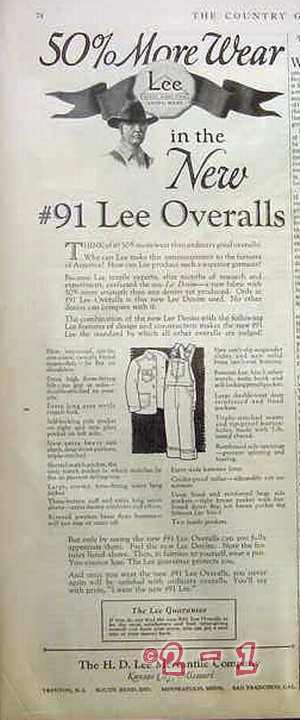 Original old men's clothing magazine vintage ad for H. D. LEE MERCANTILE COMPANY. Main office and factory was located in Kansas City, MO. 50 Percent More Wear in the New 91 Lee Denim Overalls. This fractional page 1926 magazine advertisement would display beautifully matted and framed.