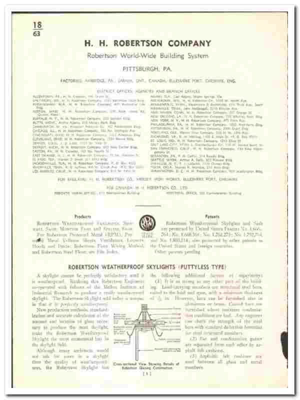Products include Robertson Weatherproof Skylights (Puttyless Type), Robertson Single Pitch Weatherproof Skylights, Robertson Sidewall Sash (Puttyless Type), Robertson Floating Mounting Skylights and the Robertson Streamline Structural Sash, all are fully featured.
