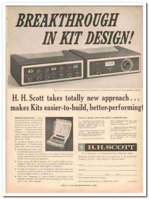 Original vintage ad for H. H. SCOTT INC. LK-72 amplifier, LT-10 wide-band tuner kit, breakthrough in kit design. New approach makes Kits easier to build, better performing. All mechanical parts such as terminal strips and tube sockets are pre-riveted to the chassis, every wire and cable cut to exact length and prestripped, full color diagrams in easy to follow instruction book simplify assembly and reduce errors.