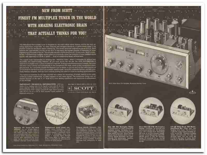 Original old magazine vintage ad for H. H. SCOTT INC. Main office and factory was located at 111 Powdermill Road, Maynard, MA. The model 4310 FM Multiplex Broadcast Tuner. With amazing electronic brain that actually thinks for you. Designed for the most critical stereo listener and for the most exacting applications imaginable. Its man features and stringent standards of performance make it the prudent choice for broadcast station monitoring. This unique old two page 1962 high fidelity stereo component trade magazine advertisement would display beautifully matted and framed. It would make a nice accompaniment to your vintage stereo.
