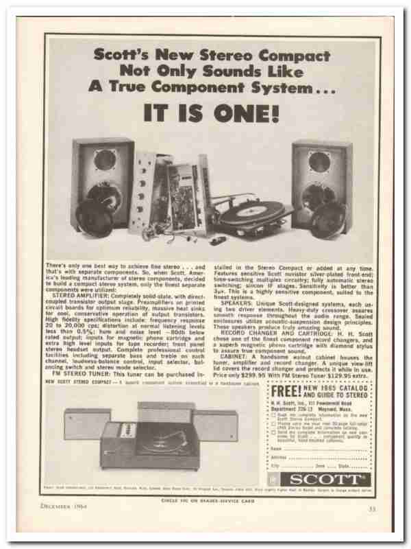 Original old stereo magazine vintage ad for H. H. SCOTT INC. Main office and factory was located at 111 Powdermill Road, Maynard, MA. Stereo Compact not only sounds like a True Component System, It Is One! Solid state amplifier, FM tuner, speakers using two driver elements, the finest record changer, magnetic phono cartridge with diamond stylus assures true sound. This unique old one page 1964 high fidelity trade magazine advertisement would display beautifully matted and framed. It would make a nice accompaniment to your vintage stereo.