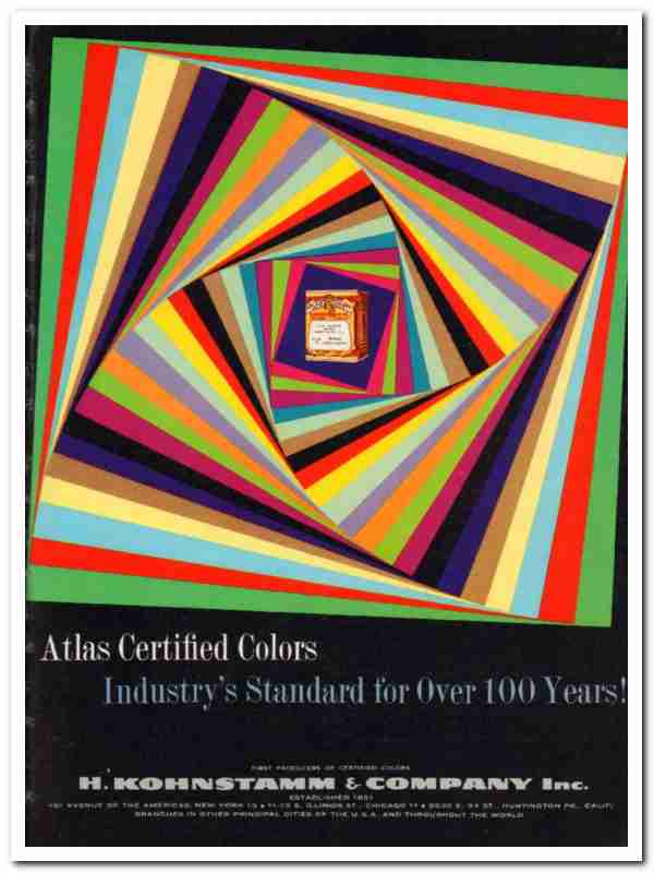 Original ice cream trade magazine vintage ad for H. KOHNSTAMM & COMPANY, INC. Main office was located at 161 Avenue of the Americas, New York City, NY. Manufacturers of Atlas Certified Colors. Industry's Standard for over 100 years. First producer of certified colors. This unique 1959 old dairy industry magazine advertisement would display wonderful matted and framed. Nice graphics.