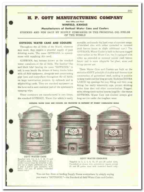 Throughout the oil fields of the World, wherever men work, they require a plentiful supply of people drinking water. The name GOTKOOL is synonymous with supplying this need. GOTKOOL has become known as the standard water containers of the oil fields. The familiar blue and black label bearing the name 'GOTKOOL' in red, is seen besides the drivers of heavy trucks laden with oil field equipment, alongside men constructing pipelines and everywhere throughout the oil fields, on large construction projects, by railroads and in shipyards. They are standard equipment on the farm and a most essential part of sportsman's camping trips.