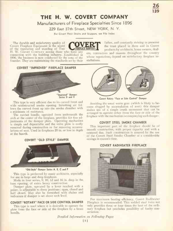 Original heating trade vintage catalog for THE H. W. COVERT COMPANY. Main office and factory was located at 229 East 37th Street, New York City, NY. Manufacturers of Radiheater Fireplace Equipment. Damper, Steel Smoke Chamber, Air Heating, Intake Grill and Crane. Disbound from a large 1938 home builders heating catalog, this unique old five page technical specifications brochure would display wonderfully matted and framed. A marvelous addition to your retro heating equipment library.