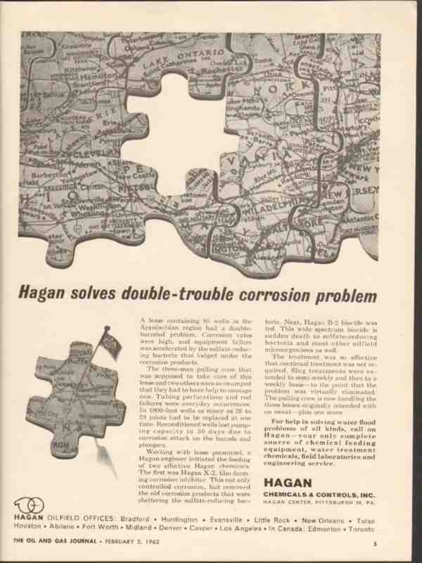 Original oil and gas trade magazine vintage ad for HAGAN CHEMICALS & CONTROLS, INC. Main office and factory was located at Hagen Center, Pittsburgh, PA. Hagan Solves Double-Trouble Corrosion Problem. Hagan X-2 Corrosion Inhibitor and Hagan B-2 Biocide. This unique 1962 petroleum petrochemical industry magazine advertisement would display beautifully matted and framed.