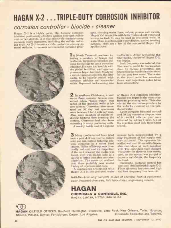 Original oil and gas trade magazine vintage ad for HAGAN CHEMICALS & CONTROLS, INC. was located at Hagen Center, Pittsburgh, PA. Hagan X-2. Triple Duty Corrosion Inhibitor Corrosion Controller, Biocide, Cleaner. Your only complete source of chemical feeding equipment, water treatment chemicals, field laboratories, engineering service. This unique 1962 old petroleum industry magazine advertisement would display beautifully matted and framed.