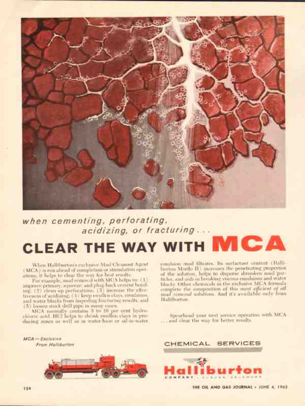 Original oil and gas trade magazine vintage ad for HALLIBURTON COMPANY of Duncan, OK.  When Cementing, Perforating, Acidizing, or Fracturing Clear the Way with MCA.  Halliburton Mud Cleanout Agent. This unique 1962 old oilfield petroleum well drilling and chemical services industry magazine advertisement would display beautifully matted and framed. Nice graphics.