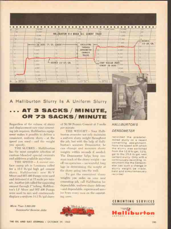 Original oil and gas trade magazine vintage ad for HALLIBURTON COMPANY of Duncan, OK.  A Halliburton Slurry is a Uniform Slurry. Halliburton's Densometer makes it possible to deliver a consistent, uniform slurry at the speed you need. This unique 1962 old oilfield petroleum well cementing service magazine advertisement would display beautifully matted and framed.