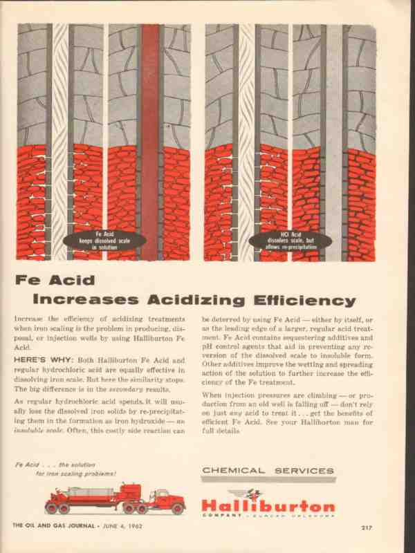 Original oil and gas trade magazine vintage ad for HALLIBURTON COMPANY of Duncan, OK. FE Acid Increases Acidizing Efficiency .The solution for iron scaling problems. This unique 1962 old oilfield petroleum drilling and chemical services industry magazine advertisement would display beautifully matted and framed.