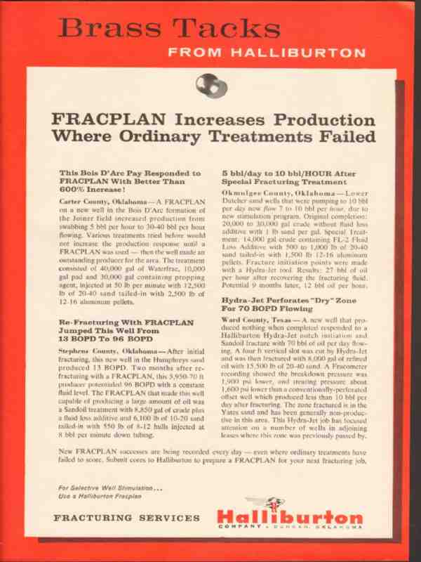 Original oil and gas trade magazine vintage ad for HALLIBURTON COMPANY of Duncan, OK.  Fracplan Increases Production Where Ordinary Treatments Failed. In Carter County, Oklahoma, a Fracplan on a new well in the Bois D-Arc formation of the Joiner Field increased production to 30-40 bbl per hour flowing. This unique 1962 old oilfield petroleum well industry magazine advertisement would display beautifully matted and framed. Nice graphics.