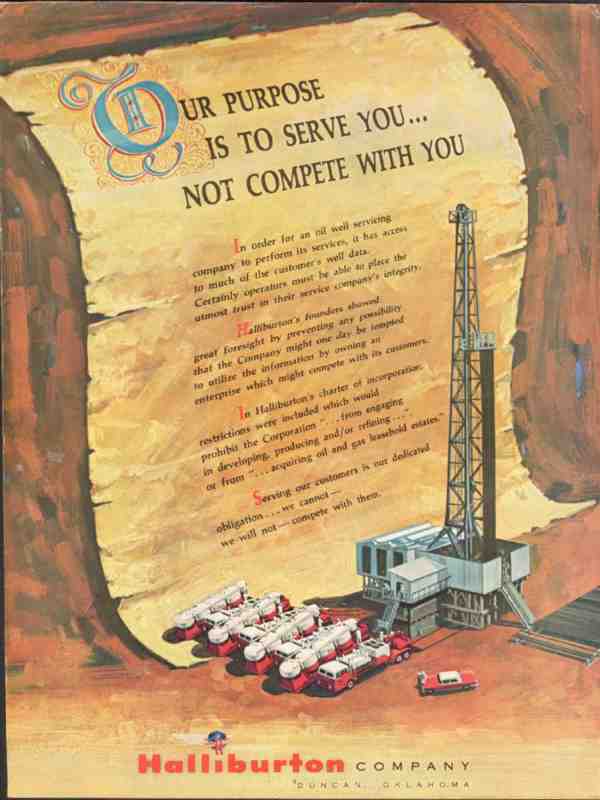 Original oil and gas trade magazine vintage ad for HALLIBURTON COMPANY of Duncan, OK.  Our Purpose Is To Serve You, Not Compete With You. This unique 1962 old oilfield petroleum well data industry magazine advertisement would display beautifully matted and framed. Nice graphics.
