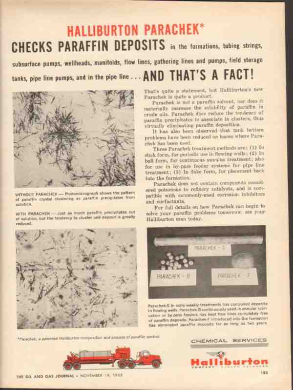 Original oil and gas trade magazine vintage ad for HALLIBURTON COMPANY of Duncan, OK. Halliburton Parachek Checks Paraffin Deposits in the Formations, Tubing Strings, Subsurface Pumps, Wellheads, Gathering Lines and Pumps, Tanks, Pipe Line Pumps and Pipe Line. This unique 1962 old oilfield petroleum well chemical services industry magazine advertisement would display beautifully matted and framed.