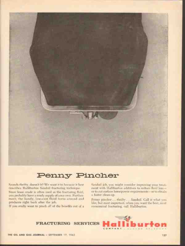 Original oil and gas trade magazine vintage ad for HALLIBURTON COMPANY of Duncan, OK. Penny Pincher. Halliburton Sandoil Fracturing Technique. This unique 1962 old oilfield petroleum well fracturing services magazine advertisement would display beautifully matted and framed.
