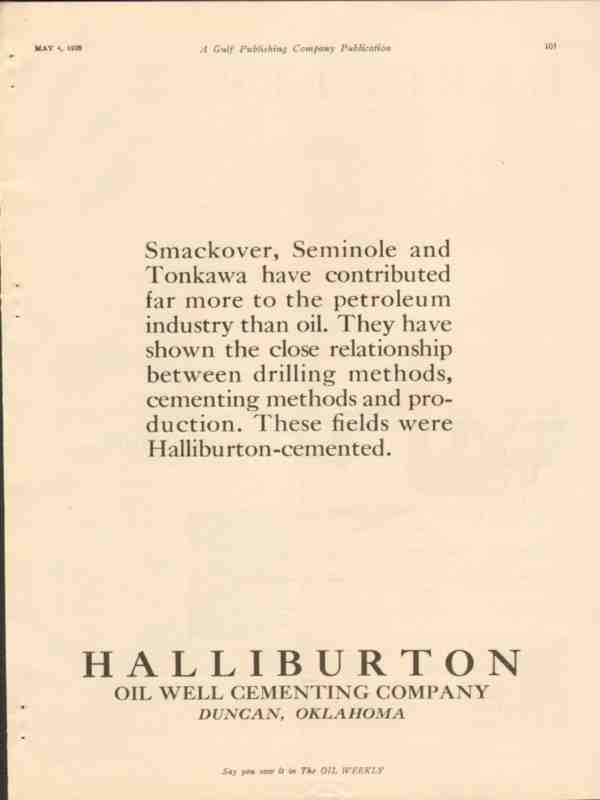 Original oil and gas trade magazine vintage ad for HALLIBURTON OIL WELL CEMENTING COMPANY of Duncan, OK.  Smackover, Seminole and Tonkawa have contributed far more to the petroleum industry than oil. Unique 1928 old oilfield petroleum industry magazine advertisement.