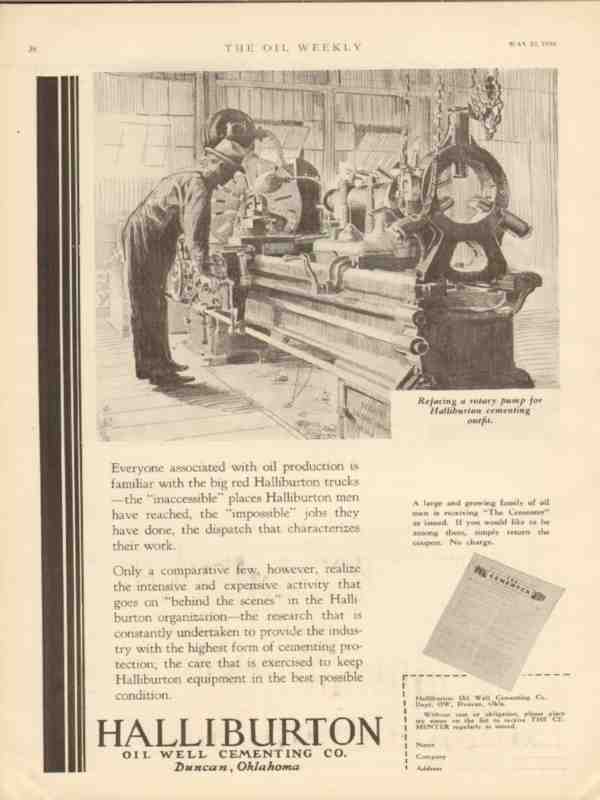 Original oil and gas trade magazine vintage ad for HALLIBURTON OIL WELL CEMENTING COMPANY of Duncan, OK. Everyone associated with oil production is familiar with the big red Halliburton trucks, the inaccessible places Halliburton men have reached, the impossible jobs they have done, the dispatch that characterizes their work. Refacing a rotary pump of Halliburton cementing outfit. Unique 1930 old oilfield petroleum equipment magazine advertisement. Nice graphics.