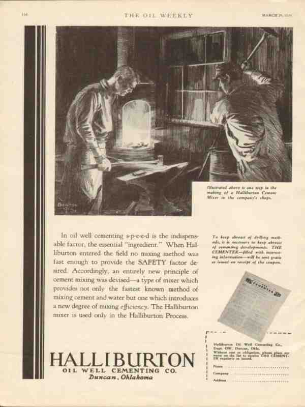Original oil and gas trade magazine vintage ad for HALLIBURTON OIL WELL CEMENTING COMPANY of Duncan, OK. In oil well cementing, speed is the indispensable factor, the essential ingredient. Illustrated is one step in the making of a Halliburton Cement Mixer in the company's shops. Art work by Benton. Uniquw 1930 old oilfield petroleum equipment magazine advertisement. Nice graphics.