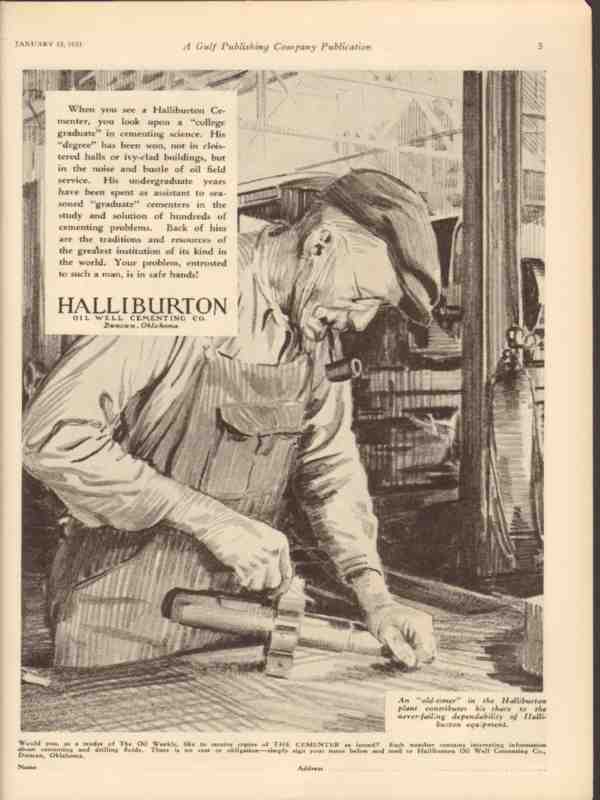 Original oil and gas trade magazine vintage ad for HALLIBURTON OIL WELL CEMENTING COMPANY. Main office and factory was located in Duncan, OK.  When you see a Halliburton Cementer, you look upon a College Graduate in cementing science. His Degree has been won in the noise and bustle of oil field service. This unique 1931 old oilfield petroleum well drilling and pumping equipment magazine advertisement would display beautifully matted and framed. Nice graphics.