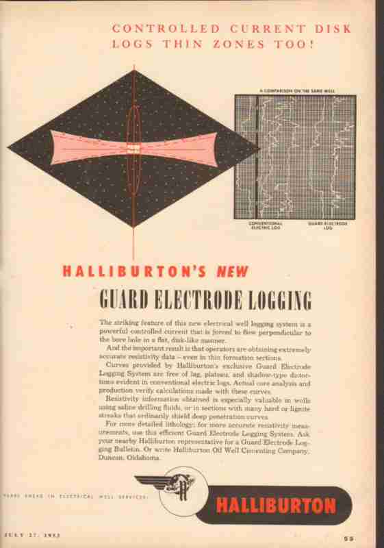 Original oil and gas trade magazine vintage ad for HALLIBURTON OIL WELL CEMENTING COMPANY of Duncan, OK. Guard Electrode Logging, controlled current disk logs thin zones too. The striking feature of this new system is a powerful controlled current that is forced to flow perpendicular to the bore hole in a flat, disk-like manner. This unique 1953 old one page oilfield petroleum equipment industry magazine advertisement would display beautifully matted and framed. Nice graphics.