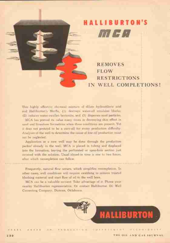 Original oil and gas trade magazine vintage ad for HALLIBURTON OIL WELL CEMENTING COMPANY of Duncan, OK. MCA removes flow restrictions in well completions. This highly effective chemical mixture of dilute hydrochloric acid and Morflo destroys water-oil emulsion blocks, reduces water swollen bentonite and disperses mud particles. This unique 1953 old oilfield petroleum industry magazine advertisement would display beautifully matted and framed. Nice graphics.
