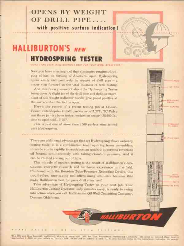 Original oil and gas trade magazine vintage ad for HALLIBURTON OIL WELL CEMENTING COMPANY of Duncan, OK. Opens by Weight of Drill Pipe. Hydrospring Tester. This unique 1953 old oilfield petroleum equipment industry magazine advertisement would display beautifully matted and framed.