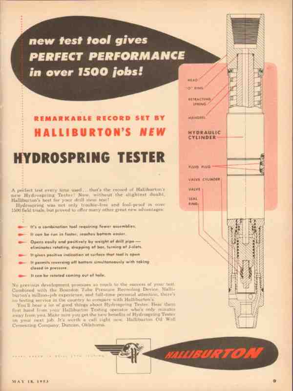 Original oil and gas trade magazine vintage ad for HALLIBURTON OIL WELL CEMENTING COMPANY of Duncan, OK.  Perfect Performance. Halliburton's new Hydrospring Tester.  Best for your drill stem test. This unique 1953 old oilfield petroleum industry magazine advertisement would display beautifully matted and framed.