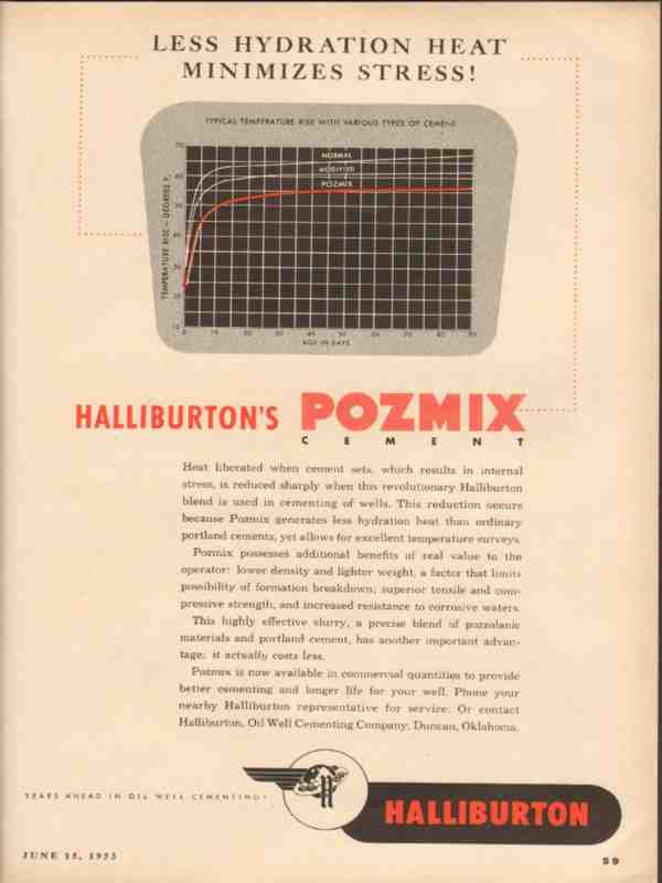 Original oil and gas trade magazine vintage ad for HALLIBURTON OIL WELL CEMENTING COMPANY of Duncan, OK. Pozmix Cement, Less Hydration Heat Minimizes Stress. This unique 1953 old oilfield petroleum drilling industry magazine advertisement would display beautifully matted and framed.