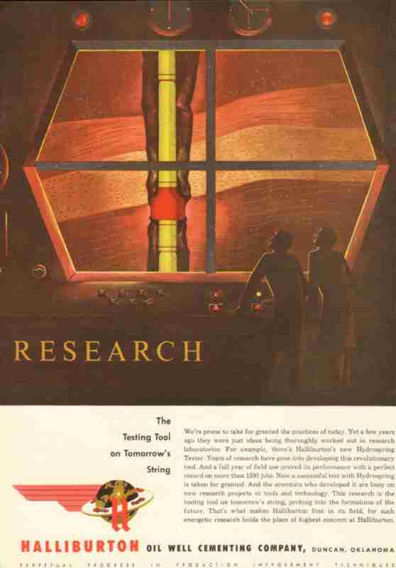 Original oil and gas trade magazine vintage ad for HALLIBURTON OIL WELL CEMENTING COMPANY of Duncan, OK. Research, Testing Tool on Tomorrow's String. Hydrospring tester proved its performance with a perfect record on more than 1500 jobs in a full year of field use. This unique 1953 old oilfield petroleum drilling industry magazine advertisement would display beautifully matted and framed. Nice graphics.