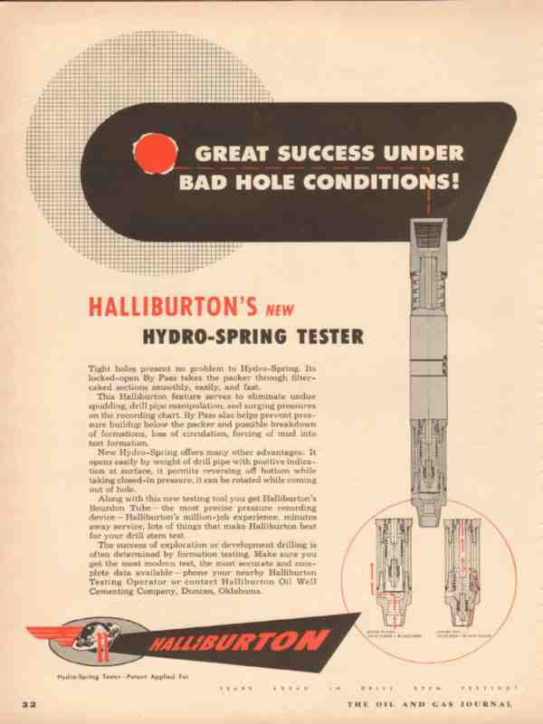 Original oil and gas trade magazine vintage ad for HALLIBURTON OIL WELL CEMENTING COMPANY of Duncan, OK. Great Success Under Bad Hole Conditions. Halliburton's new Hydro-Spring Tester. This unique 1953 old oilfield petroleum drilling industry equipment magazine advertisement would display beautifully matted and framed. Nice graphics.