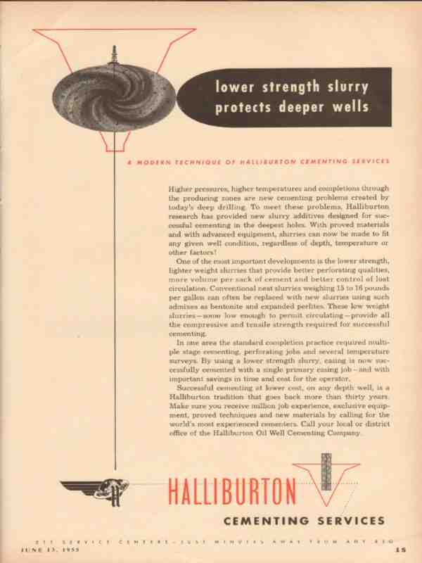 Original oil and gas trade magazine vintage ad for HALLIBURTON OIL WELL CEMENTING.COMPANY of Duncan, OK. Lower Strength Slurry Protects Deeper Wells. This unique 1955 old oilfield petroleum drilling industry magazine advertisement would display beautifully matted and framed.