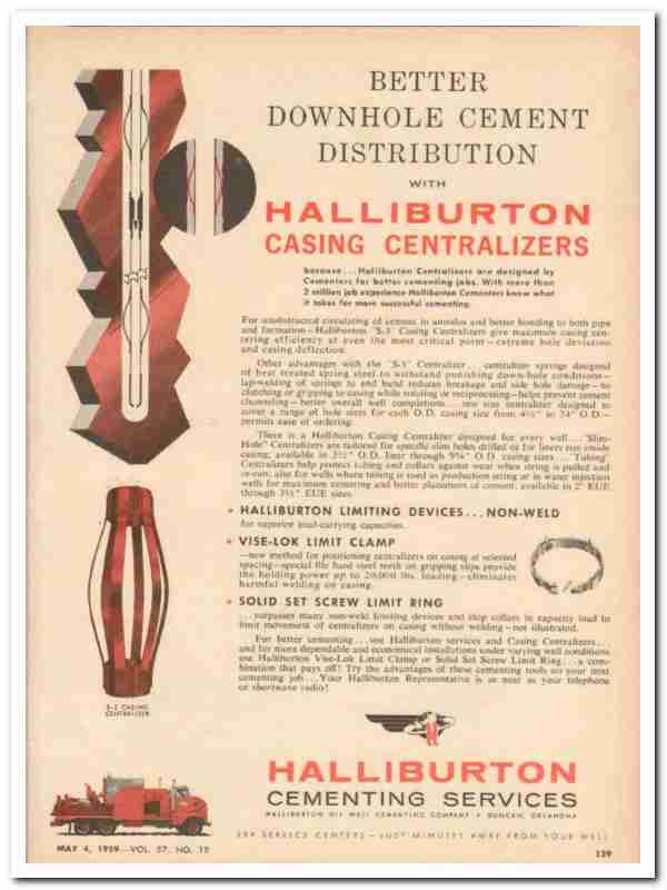 Original oil and gas trade magazine vintage ad for HALLIBURTON OIL WELL CEMENTING COMPANY. Main offices were located in Duncan, OK. Better Downhole with Casing Centralizers. Designed by cementers for better cementing jobs. This unique 1959 old oilfield petroleum drilling equipment industry magazine advertisement would display beautifully matted and framed. Nice graphics.