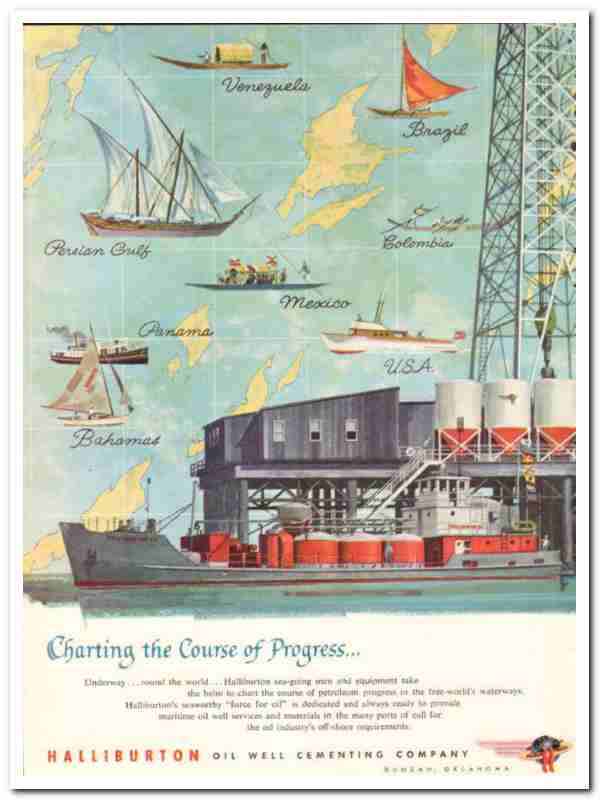 Original oil and gas trade magazine vintage ad for HALLIBURTON OIL WELL CEMENTING COMPANY. Main offices were located in Duncan, OK. Charting the Course of Progress. Sea-going men and equipment take the helm in the free-word's waterways. Ready to provide maritime oil well services and materials the many ports of call for the oil industry's off-shore requirements. This unique 1959 old oilfield petroleum drilling industry magazine advertisement would display beautifully matted and framed. Nice graphics.